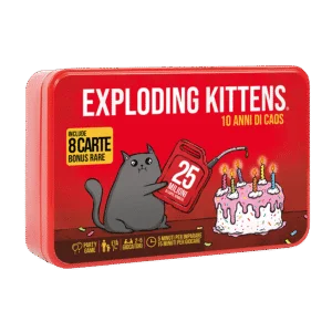 Un’edizione speciale per celebrare il decimo anniversario di: Exploding Kittens! Come? Con lo stesso gioco che vi ha fatto innamorare, in una più elegante e resistente scatola in latta e ben 8 carte bonus rare, introdotte in espansioni passate ma ormai fuori catalogo. Queste carte vengono ora reintrodotte con maggiori specifiche, anche a simboleggiare l’evoluzione del titolo negli anni.