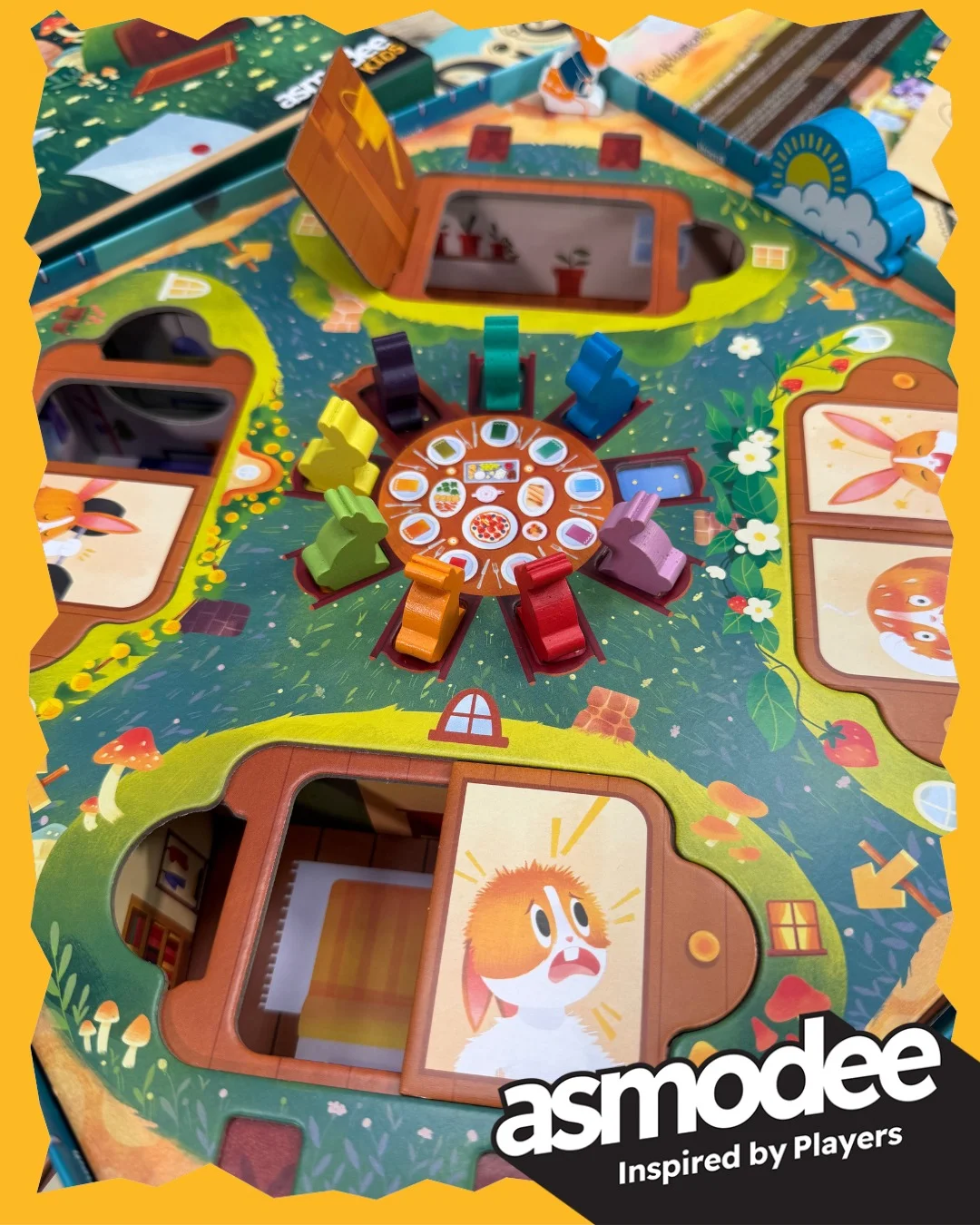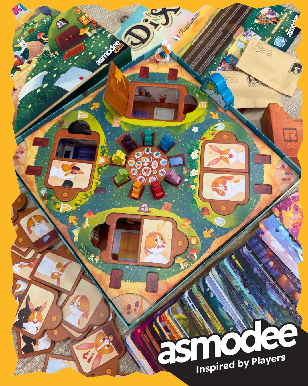 Dixit Kids è un gioco collaborativo in cui dovrete invitare quanti più conigli possibile alla festa di compleanno di Coniglia Corriera! Durante un turno, un giocatore interpreterà Coniglia Corriera. Quando visita una Tana, sceglie uno dei conigli come suo Ospite. Coniglia Corriera sceglie dalla propria mano una carta che corrisponda allo stato d’animo dell’Ospite: quella carta è l‘Invito. Gli altri giocatori sono i Coniglietti Portalettere. Devono consegnare la posta al coniglio che Coniglia Corriera non ha scelto. Poi devono trovare l’Invito nella posta per poterlo mettere nella zampa dell’Ospite.