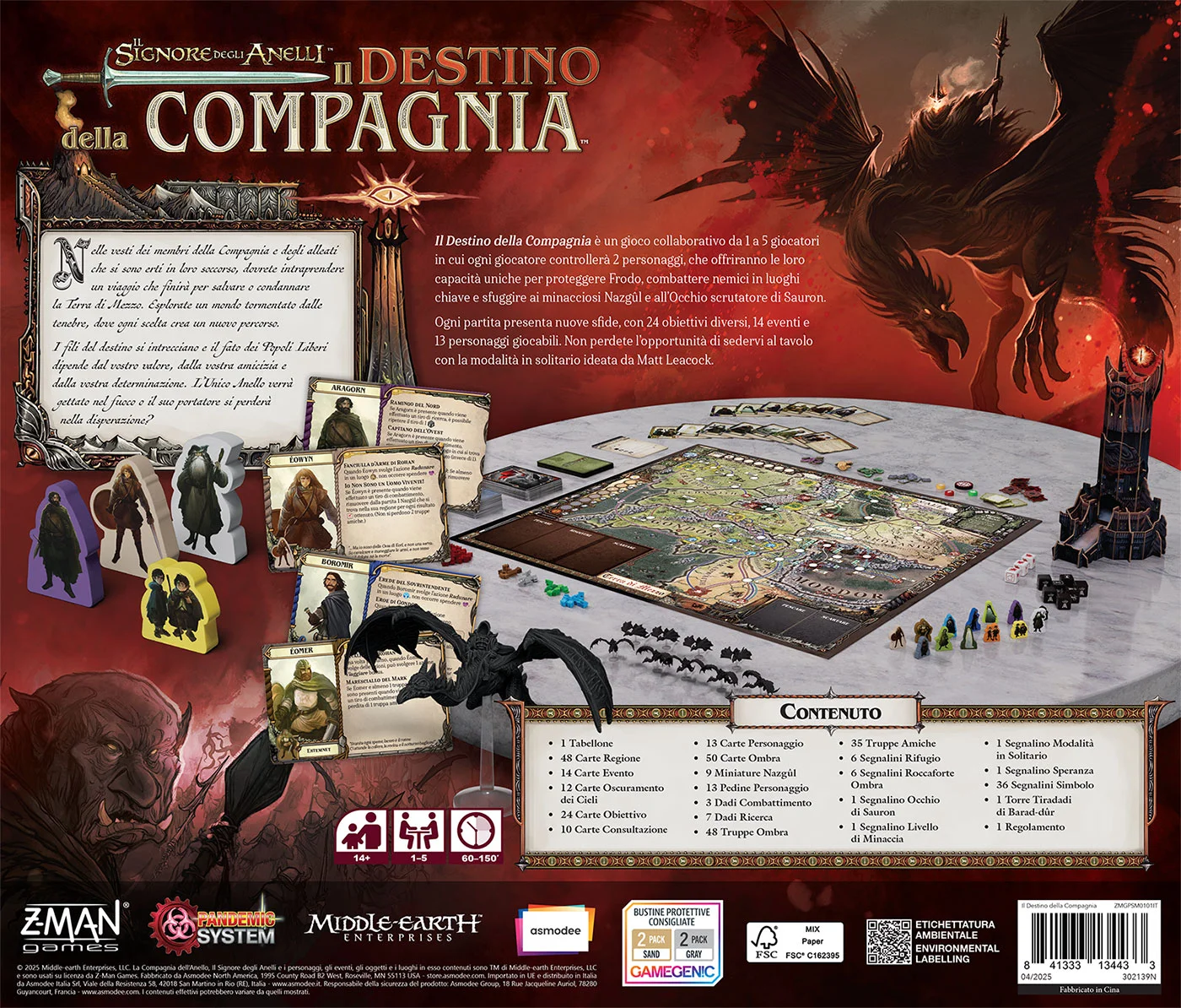 Il Destino della Compagnia è un gioco collaborativo da 1 a 5 giocatori in cui ogni giocatore controllerà 2 personaggi, che offriranno le loro capacità uniche per proteggere Frodo, combattere nemici in luoghi chiave e sfuggire ai minacciosi Nazgûl e all’Occhio scrutatore di Sauron.
