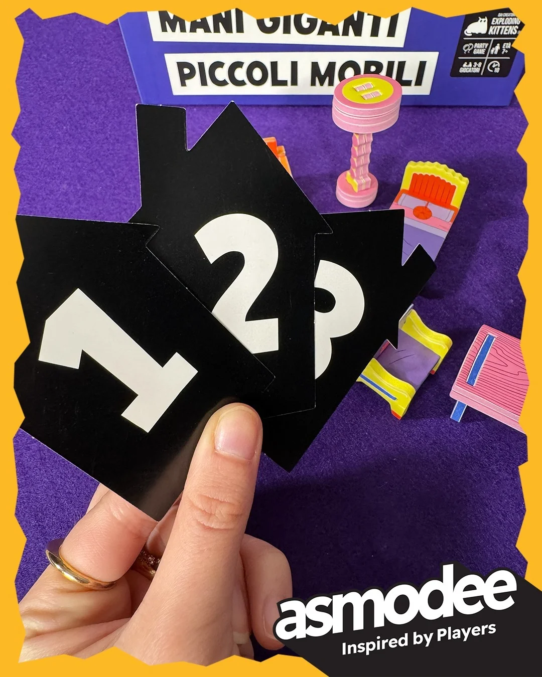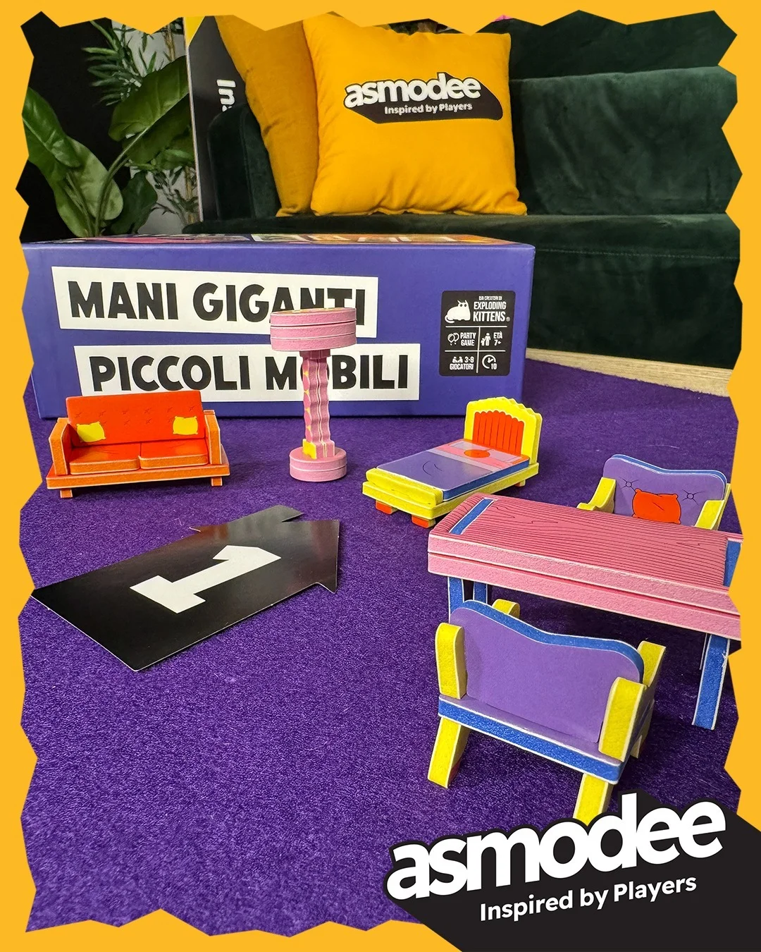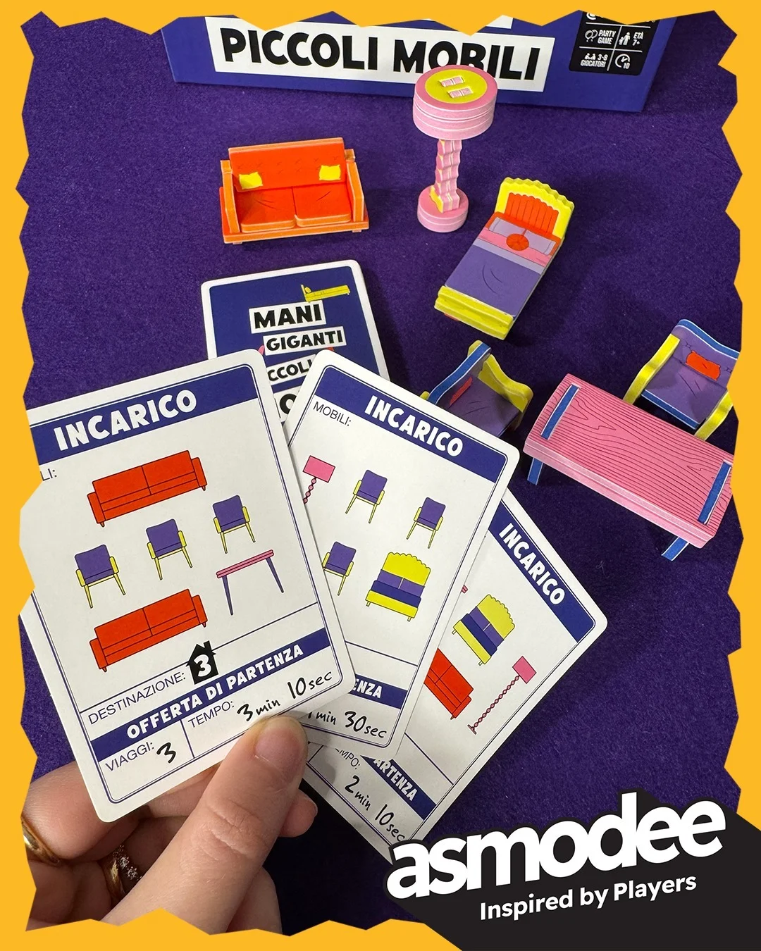 Voi e i vostri amici siete giganti che lavorano per ditte di traslochi rivali! Il vostro compito? Consegnare in fretta i piccoli mobili utilizzando solo i vostri mignoli. La carta incarico vi dice cosa fare: sfidatevi per stabilire quale squadra sarà in grado di svolgere l’incarico al meglio.