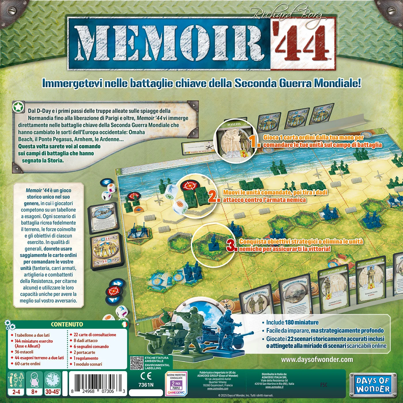 Memoir ’44 è un gioco storico unico nel suo genere, in cui i giocatori competono su un tabellone a esagoni. Ogni scenario di battaglia ricrea fedelmente il terreno, le forze coinvolte e gli obiettivi di ciascun esercito. In qualità di generali, dovrete usare saggiamente le carte ordini per comandare le vostre unità (fanteria, carri armati, artiglieria e combattenti della Resistenza, per citarne alcune) e utilizzare le loro capacità uniche per avere la meglio sul vostro avversario.