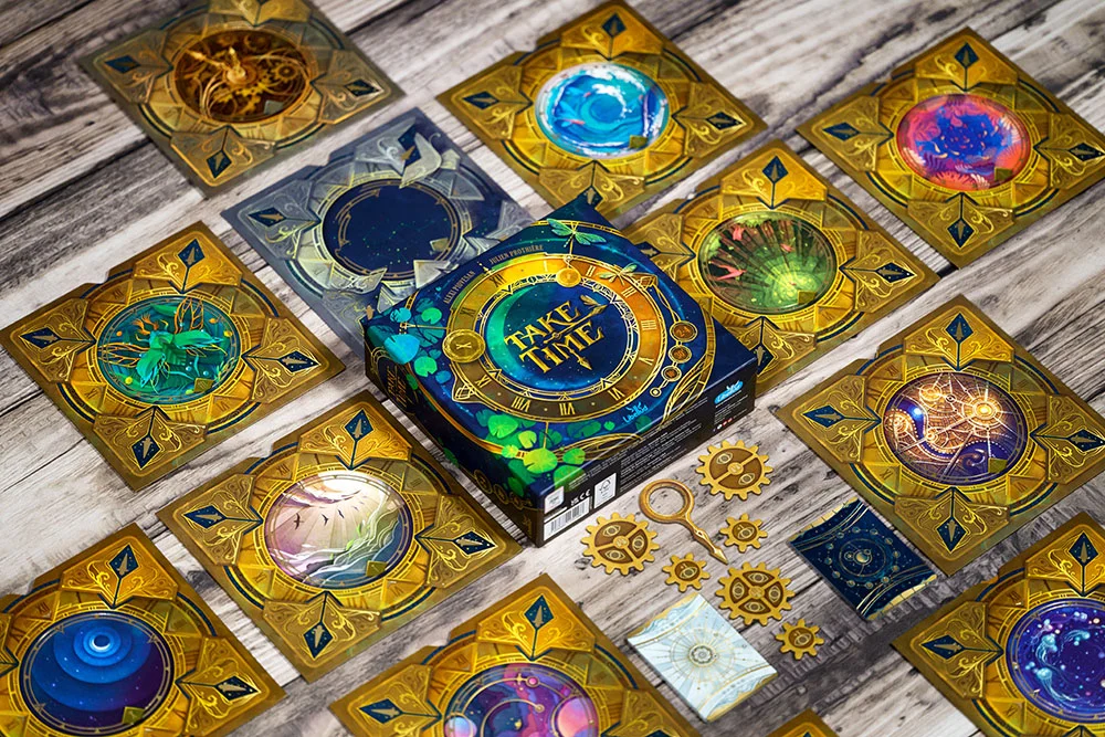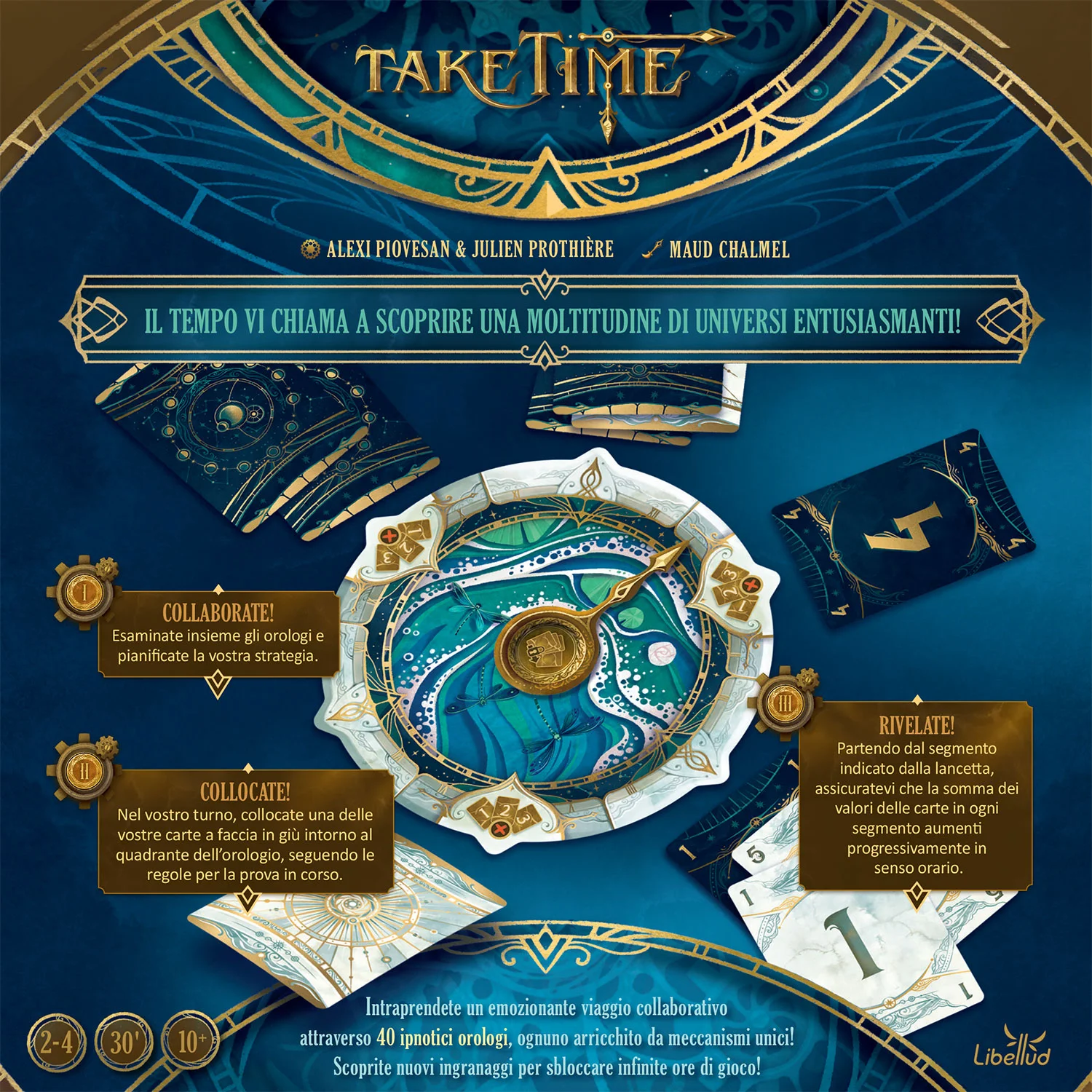 Take Time è un gioco collaborativo in cui i giocatori agiscono insieme per superare varie prove, perdendo o vincendo come una squadra. Per avere successo, dovete giocare in modo strategico 12 carte a faccia in giù intorno a un orologio, seguendo le regole speciali fornite per ogni prova. Il gioco include 40 prove, ognuna con difficoltà crescente e nuove regole da rispettare per poter giocare. Prendetevi il vostro tempo per immergervi in questo meraviglioso viaggio dall’inizio alla fine!